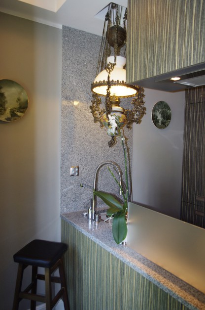 Aneks kuchenny eklektyczny - połączenie nowoczesnej kolorystyki forniru frontów z klasycznymi dodatkami.