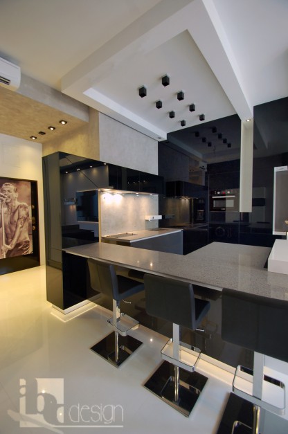 Nowoczesne, biało-czarne wnętrze w prostych formach przenikających się brył, meble w połysku z półwyspem lewitującym nad podświetlaną białą podłogą, ściany w wykończeniu betonowym i pomalowane białą farbą. Kuchnia połączona z meblami pokojowymi, w części salonowej sufit napinany z podświetleniem rgb.