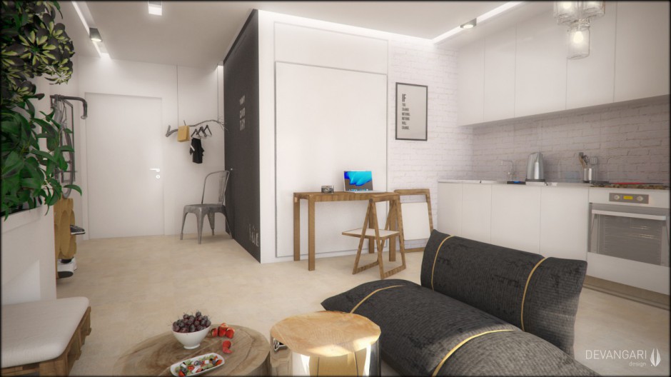 Niewielkie 34m2 mieszkanie pełne zaskakujących rozwiązań – składanych i mobilnych mebli, upcyclingowych dekoracji, biodegradowalnych materiałów wykończeniowych. Przedmiotów, którym nadano drugie życie. Atrakcję stanowi zielona ściana (tzw. wertykalny ogród), która poza swoimi walorami estetycznymi ma ogromny wpływ na psychikę i zdrowie ludzkie - zatrzymuje kurz, nawilża suche powietrze oraz korzystnie je jonizuje.