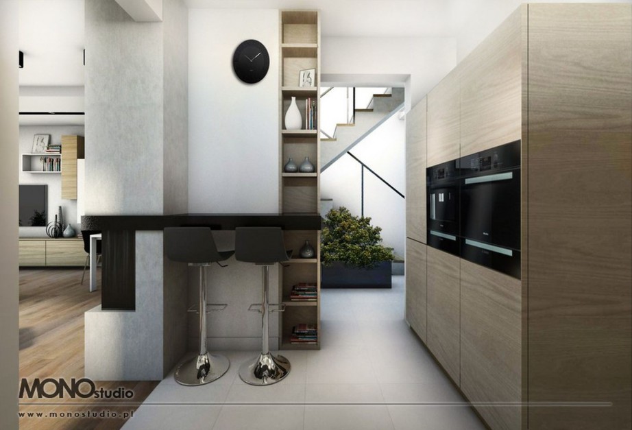 Mała funkcjonalna kuchnia w kontrastowej ale delikatnej kolorystyce