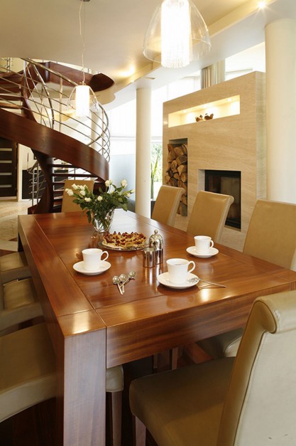 Właściciele lubią przyjmować gości, stąd duży drewniany stół wykonany z drewna merbau, a do kompletu aż osiem krzeseł w przyjemnej miękkiej tapicerce z naturalnej skóry. Fot. Marcin Onufryjuk.