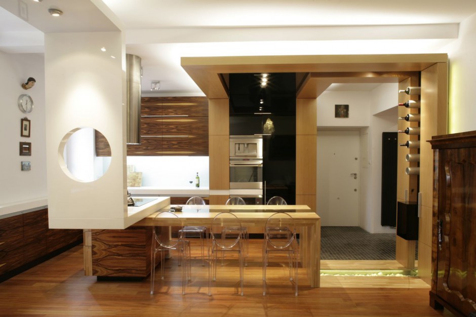 Tafla szkła w podłodze, nakrywa też niszę wypełnioną kamykami i przechodzi na stół jadalniany. Kamyki z podłogi korespondują z kamiennym blatem baru (corian), który przechodzi w podsufitowy blat z oświetleniem.Biały pas corianu jest wyspą kuchenną z płytą grzewczą, podwieszanym sufitem z własnym oświetleniem, przepierzeniem między strefą kuchenną a salonową... I wreszcie – podwyższeniem, na którym ustawiono figurę św. Barbary.