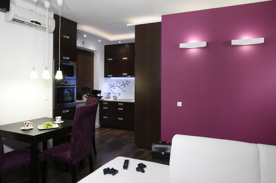 Na pograniczu kuchni i salonu znalazło się miejsce na niewielki stolik jadalniany (IKEA), który po rozłożeniu pomieści dodatkowo kilkoro gości. Dopasowano do niego wygodne krzesła z barwionego na fioletowo nubuku wykonane na specjalne zamówienie. Fot. Monika Filipiuk.