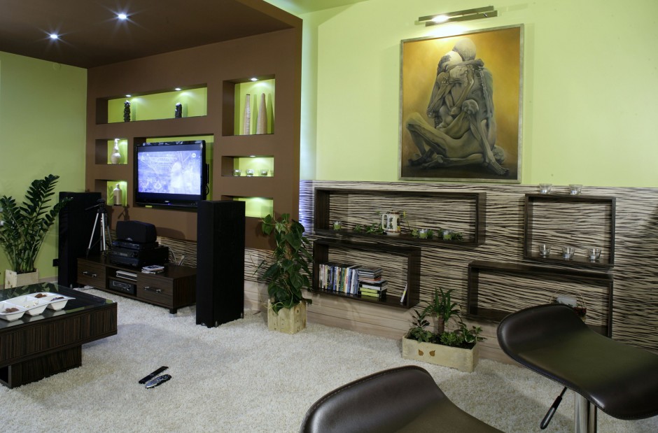 Mieszkanie jest równie dynamiczne i wyraziste, jak temperamenty jego użytkowników. Wystarczy wymienić kolory i materiały, jakie pojawiają się na stosunkowo niewielkiej, zintegrowanej przestrzeni (kuchnia, salon i hol stanowią jedną całość): ciemny mahoń, kontrastujące z nim mocno wybarwione zebrano, lekko lakierowany na biało jesion, czekoladowe płytki, szkło, szarość, pudrowy róż, pistacja. Nie zapomnijmy o jasnym, puszystym dywanie i fakturowanej tapecie w duże koła, widocznej w holu.