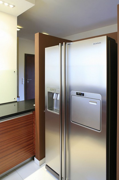 Kuchnia oraz sąsiadująca z nią jadalnia, połączona z salonem, zajmują parter domu. Niezwykle przytulnego, a jednocześnie nowoczesnego. Nie brakuje tu przestrzeni oraz nowatorskich, funkcjonalnych rozwiązań. Z kolei materiały i barwy budują klimat ciepłego, tradycyjnego wnętrza. Oryginalny charakter domu to w dużej mierze efekt współczesnej interpretacji klasycznych rozwiązań, czego przykłady można odnaleźć także w kuchni. Wybór barw (kompozycja złamanej bieli i brązu) oraz materiałów (np. fornirowane fronty meblowe) to tylko z pozoru zapowiedź wnętrza ze wszech miar klasycznego. Okazuje się bowiem, że kuchnia jest w pełni nowoczesna, mimo to emanuje ciepłem. Zabudowę niewielkiej kuchni stanowią szafki dolne oraz dwa wysokie słupki, w których umieszczono sprzęt AGD (ekspres do kawy, piekarnik, mikrofalówka).