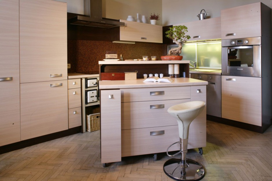 Kuchnia, znajdująca się w starej kamienicy, od samego początku kryła w sobie niespodzianki, odziedziczone po poprzednich mieszkańcach. Na suficie zachował się plafon – rzadko dziś już spotykany rodzaj zdobienia stropu, który nowi właściciele odnowili i wyeksponowali. W kuchni pozostała też metalowa „angielka” – unikatowy i urokliwy mebelek, który oczyszczono i zaadaptowano jako schowek na patelnie. Dobrze zachowane drzwi oraz piękny, dębowy parkiet również zostały docenione i pobejcowane na świeży, biały kolor. Elementem, który organizuje przestrzeń, jest wyspa na kółkach, na co dzień będąca pojemną szafką, stolikiem lub barkiem. Gdy trzeba, jest odsuwana na bok lub wywożona do innego pomieszczenia. Powstaje wówczas dodatkowe miejsce, tuż obok stworzonego do długich biesiad stołu. Przy stole stanął komplet krzeseł, przy czym w rzeczywistości żadne z nich nie należy „do kompletu”, każde jest w innym stylu.