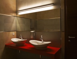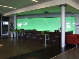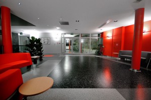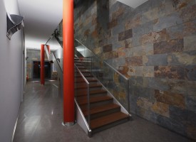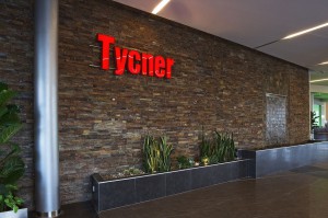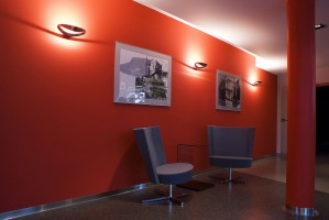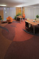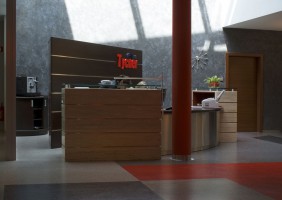Firma "Tycner" - pomieszczenia biurowe.Ściany wykończono kamieniem naturalnym, techniką dekoracyjną oraz kolorem czerwonym jako dominantą kolorystyczną. Zdjęcia Zdzisław Wieczorek.