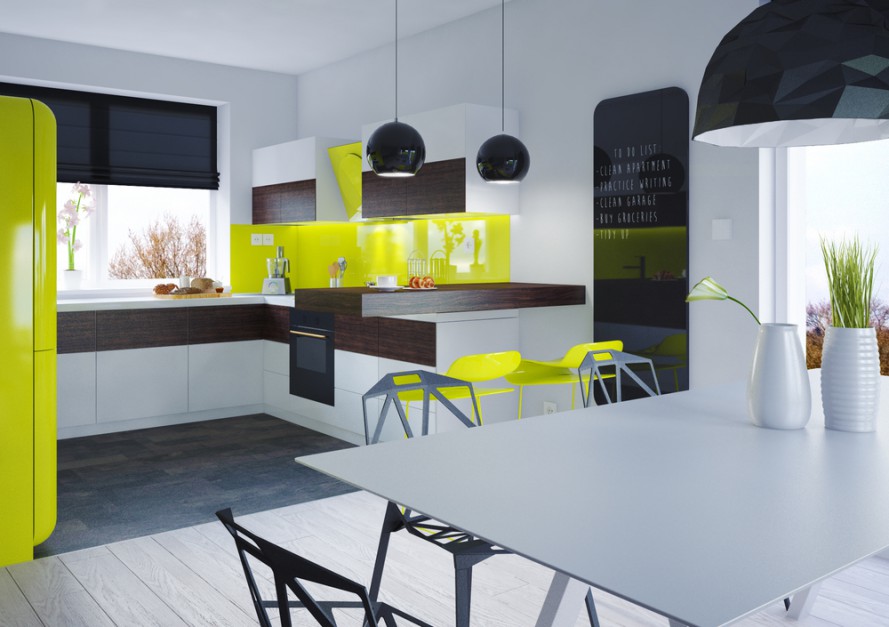 Przestronna kuchnia otwarta na jadalnię. Dominuje tu soczysta limonka, która świetnie współgra z drewnianymi frontami szafek. Przestronna,żywa i pełna światła przestrzeń sprzyja dobremu samopoczuciu domowników.