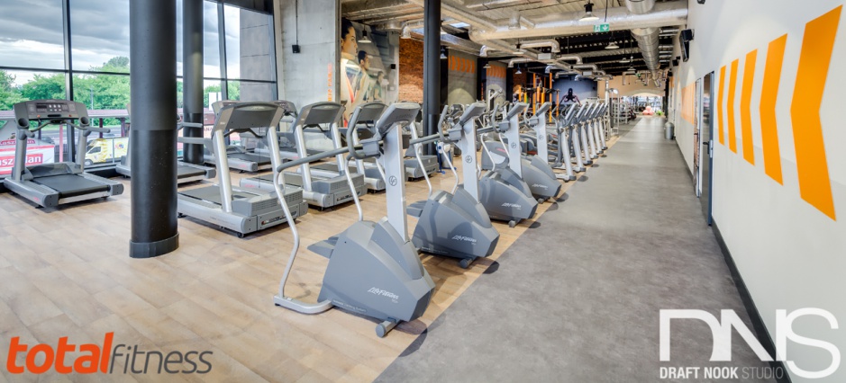 Aranżacja klubu Total Fitness w Radomiu (1250m2). Projekt w stylu industrialnym, powstały na etapie budowy centrum handlowego. Radom, 2015 rok.